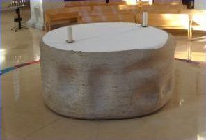 By carving a round altar table with forms cut into the circular sides Moore suggested that the centre of the church reflected the Dome of the Rock in Jerusalem commemorating the sacrifice of Abraham and Isaac as a prefiguring of the sacrifice of Jesus Christ on the cross and the place for the offering of the Eucharist at the heart of Christian worship. This place was designed for people to gather as a community around the altar where God could be found at the centre.